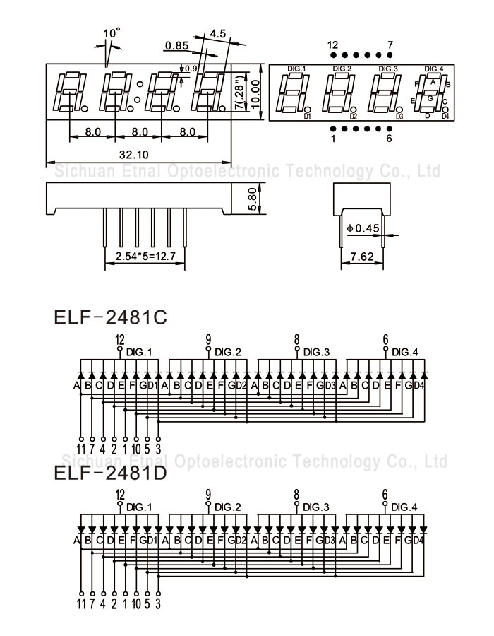 | ELF-2481DS | 0.28" inch | Four digit led display | Common Anode | Red | 5-20 | 1.8-2.0 | 620-640 |